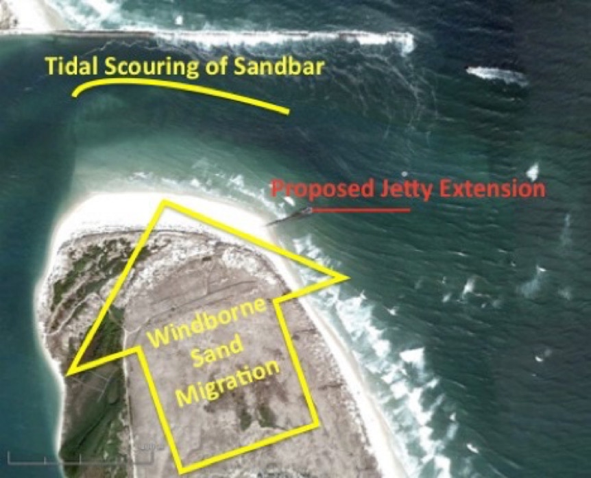 In the absence of tidal currents, the northwestward windborne sand migration would eventually close off the Inlet. In the absence of this sand migration, the tidal currents would maintain a wide and safe channel. With both processes at work, a balance is maintained, with the sand transported into the sandbar by the winds balanced by the sand scoured away from the bar by the tidal currents. If the northwestward windborne sand migration increases over a long period of time, the sandbar encroaches farther into the Inlet. This narrows the channel, which causes the speed of the tidal currents in the channel and their resulting scouring effect to increase until the northward encroachment of the sandbar is halted and balance is reestablished. If the northwestward windborne sand migration decreases, the opposite effects occur until the balance is again reestablished. Sand is continually replenished in the Smyrna Dunes Park source region through the normal process of building dunes from sand washed ashore on beaches, with some of the sand scoured from the sandbar in the inlet eventually finding its way back into the park to complete a full cycle in this very dynamic environment. I think this simple description captures the key forces at play in the Inlet and clearly shows that extension of the south jetty would not have the desired effect.
